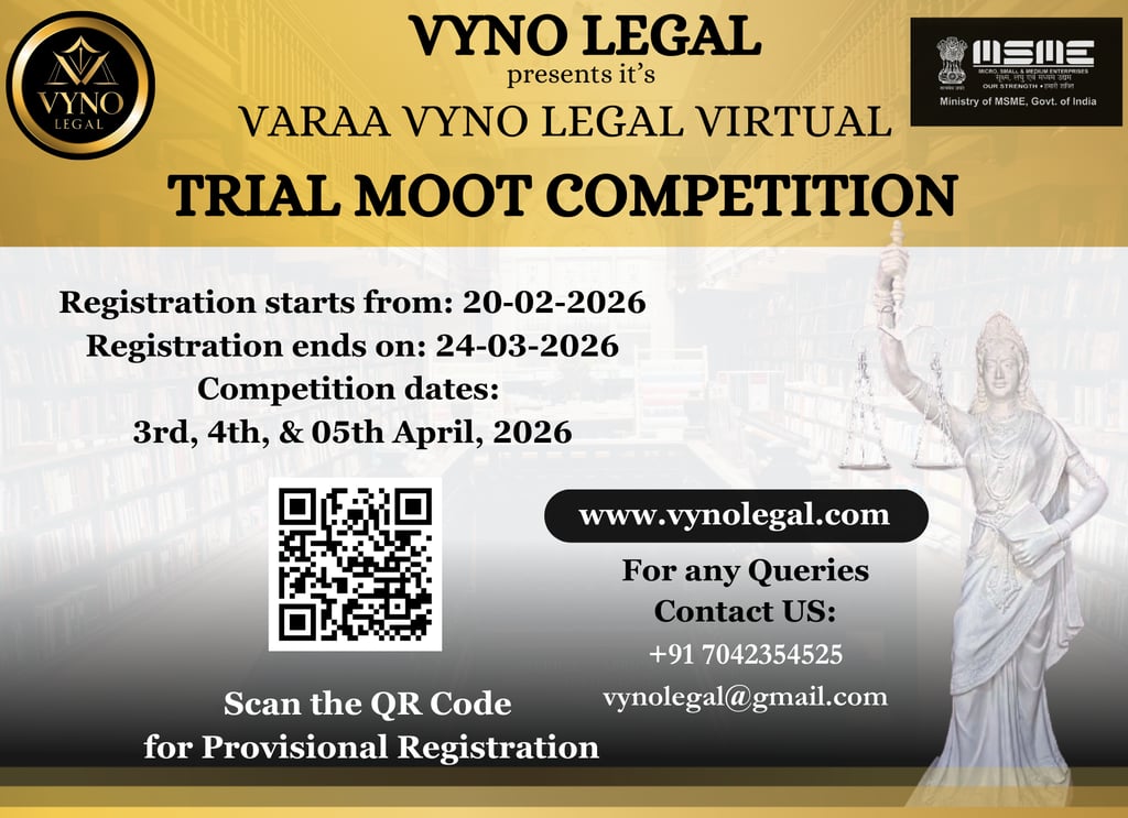 Vyno Legal proudly presents the Varaa Vyno Legal Trial Moot Competition 2026, a premier national-level virtual trial advocacy competition designed to provide law students with a realistic and immersive courtroom experience.